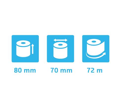 Format de la bobine : 80 mm de laize (largeur) et 70 mm de diamètre. Métrage (+ ou - 2m) : 72 m. Mandrin standard de 12 mm. Convient à toute marque de caisse thermique.
